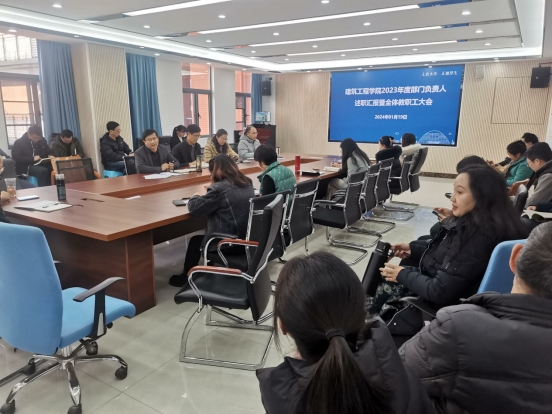 在办公楼503会议室召开学期末教职工大会暨系办科室总结汇报会,会议由党委书记王国贤主持,全院教职工参加会议。