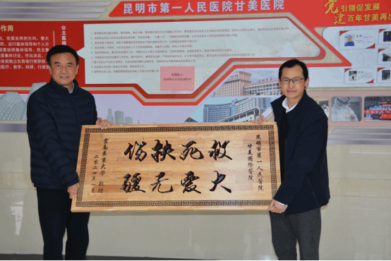 李国春代表学校向医院表示感谢,呈送了感谢信,并赠送“救死扶伤,大爱无疆”的牌匾,感谢医院在抢救我校杨春灿同学的过程中组织精锐力量,协同作战,以精湛医术和专业救治,使杨春灿同学得到了及时有效的救治,获得了第二次生命。甘美医院李震院长讲话中表示,救死扶伤是医院的神圣使命,也是医护人员的天职,只要有一丝希望都会尽百分百的努力挽救生命,同时,对学校坚持以生为本、关心关爱学生的理念而备受感动。座谈中,院校双方都表示希望以此为契机,加强院校双方的党建、团建、诊疗服务、青年教师和医护人员交流沟通等,推进双方深度合作。