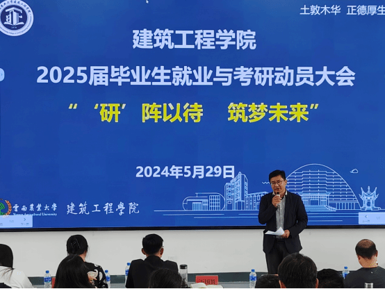 党委书记王国贤作总结讲话,他强调,当前建筑业迎来调整期,毕业生就业更加严峻,同学们要认清形势,勇敢加入到考研队伍当中,通过升学深造来增强自己的竞争力,在未来的就业与职业发展中创造更多机会。他鼓励同学们考研之路并非遥不可及,只要大家明确目标、坚定信心、不负青春,全身心投入到考研的备考中,通过不懈努力,相信同学们定能在考研的道路上取得丰硕的成果。
