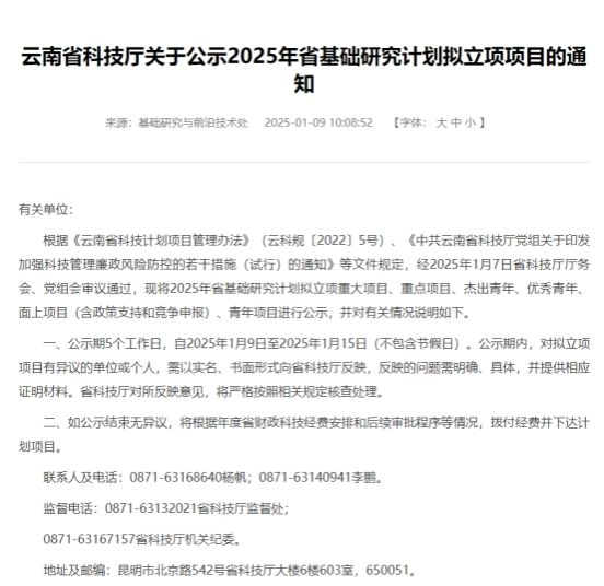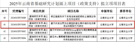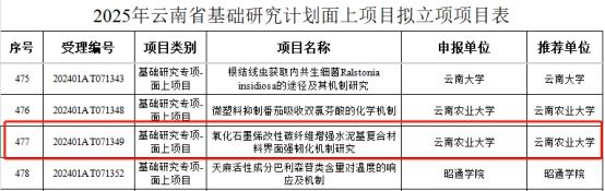 近日,云南省科技厅发布了“2025年度云南省基础研究计划项目拟立项名单”,看球通体育 张玉波、桂婉妹两位教师分别获得云南省基础研究计划面上项目及面上政策类支持项目。