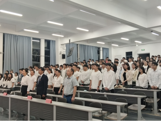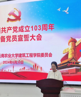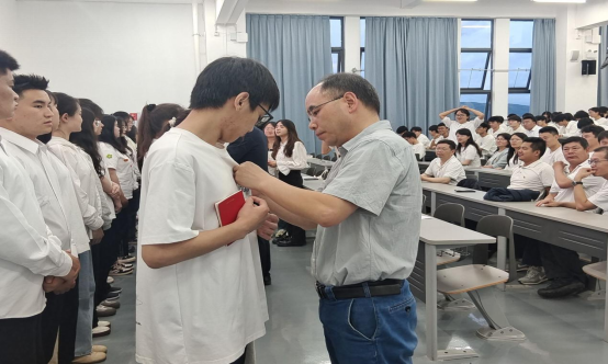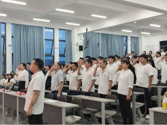 党委委员、院领导为新党员佩戴党徽并颁发《党章》。全体师生党员面向党旗庄严肃立,新党党进行入党宣誓,老党员重温入党誓词,宣誓由党群办主任周福光同志领誓,邓毅书同志监誓。