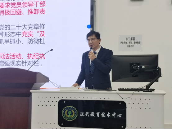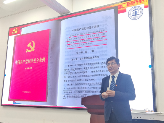 第二阶段,王国贤以“学《条例》、守党纪,构建清风正气的育人环境”为题,给全体党员讲授党纪学习教育专题党课。主要围绕:严明党纪党规的重大意义、为什么再次修订《条例》、《条例》修改的亮点重点、《条例》的有关具体规定、明纪律守规矩的实践要求、以案明纪推动党纪学习教育走深走实等六个方面进行了讲解,给与会师生党员作了一场深入浅出的纪律党课。