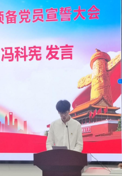 正式党员代表学生第二党支部冯科宪发言。他表示作为一名青年大学生,能够在党组织的教育培养下,成为一名光荣的共产党员,一定要不忘初心,牢记使命,树牢共产党员的理想信念,坚定维护党的团结统一,锚定中国特色社会主义现代化建设的宏伟目标,把个人青春热血与党的事业、与国家和民族的发展、与中华民族的伟大复兴融为一体,努力做到强国有我,请党放心。就要在学习上始终紧跟时代步伐,刻苦学习,认真钻研,以优异的成绩发挥好示范和表率作用,立志成长为堪当民族复兴重任的时代新人。