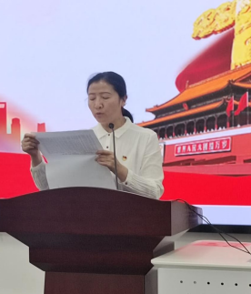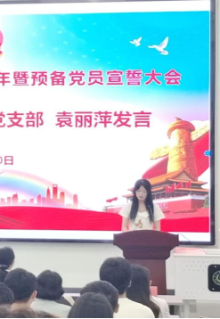 新党员代表学生第三党支部袁丽萍发言,她代表54名新党员表达了加入党组织的激动心情,表示作为一名当代大学生,在“七一”前夕向党旗光荣宣誓,深感骄傲与自豪。加入中国共产党是自己多年的坚定梦想与追求,今天在党组的培养教育下,终于如愿以偿,成为了一名中共预备党员。她表示将在新征程上,牢记党的宗旨,践行自己的誓言,在英语考级、科技竞赛、考研升学、毕业就业等各方面起好示范带头作用,争做一名优秀的共产党员。