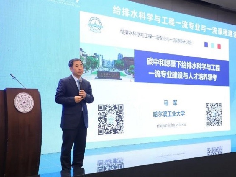 左剑恶教授主持大会主旨报告环节。给排水科学与工程专业教指委李伟光主任委员以“聚焦高质量人才培养,助力实施给排水专业‘双万计划’”为题作专业建设发展报告;中国工程院院士、清华大学特聘教授曲久辉,中国工程院院士、哈尔滨工业大学教授马军分别以“双碳背景下环境工程学科的纵横发展”“碳中和愿景下给排水科学与工程一流专业建设与人才培养思考”为题作主旨报告。