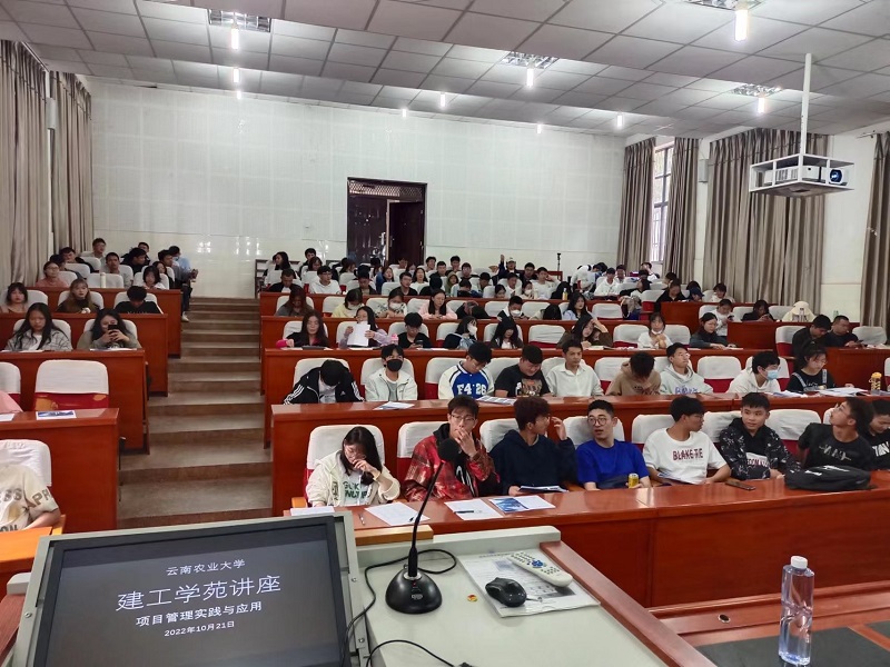 主办的“建工学苑-项目管理实践与应用”专业讲座在农学楼127阶梯教室举行,会场同时还设置腾讯会议进行现场直播,采用线上线下结合的方式,扩大交流效果。本次讲座邀请了云南风蓝项目投资咨询集团有限公司项目管理中心主任王建荣先生和人力资源中心总监李冬梅女士做主讲老师。给现场120多名来自工程管理,工程造价各年级的学生开展了一次专业认知、职业规划及就业指导的讲座。