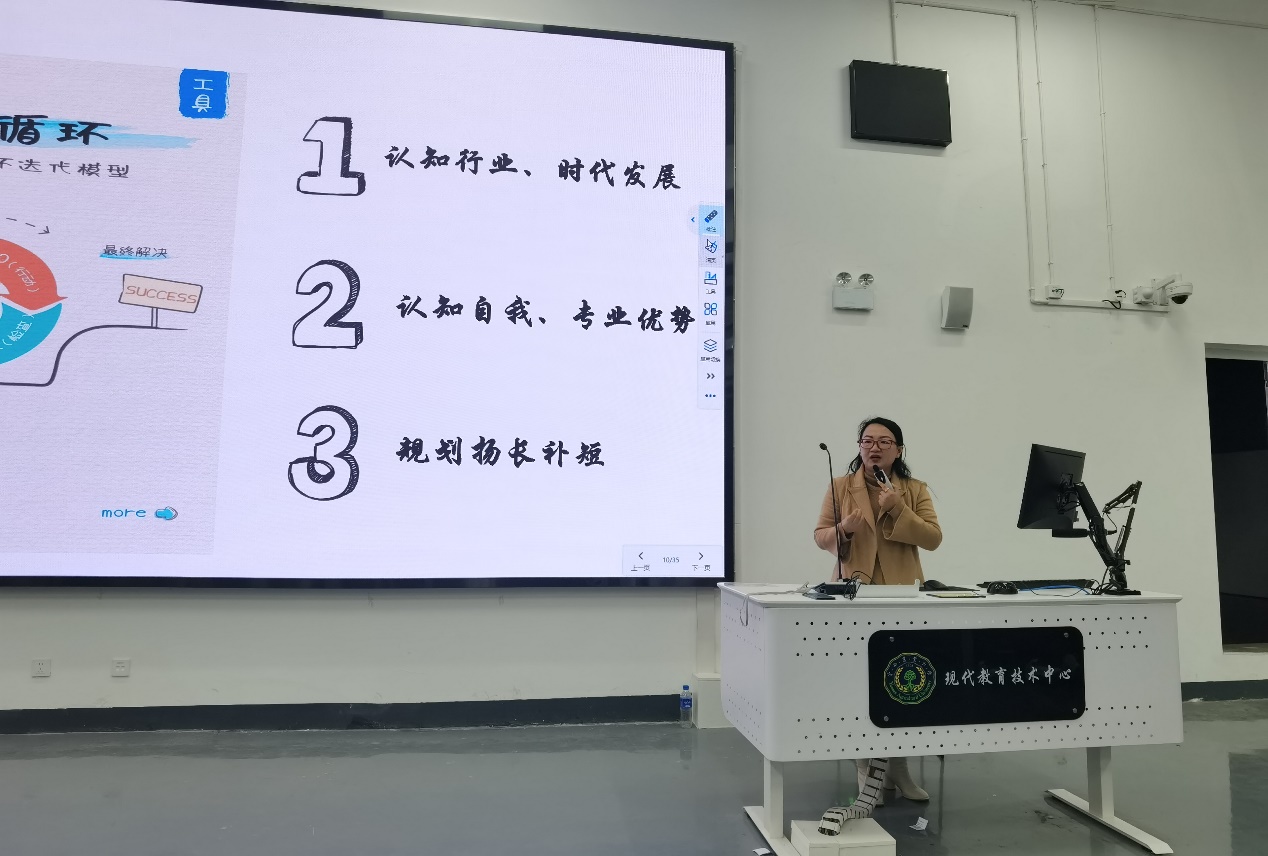 赵老师以“预见大学中正向成长的自己”为题,从“大学生面临的困惑、大学认知的升华、寻找志同道合同行人、掌握专业与提升能力、正向成长是自己的事”五个方面进行了详细的讲解,同时也对全国首届大学生职业生涯规划大赛进行了解读,详细介绍了比赛具体流程,围绕大学生为何参赛、如何备赛,通过丰富的案例和经验为在场学生解析了进行职业生涯规划的意义,引导同学们思考和探索如何在大学阶段提升和发展自己。