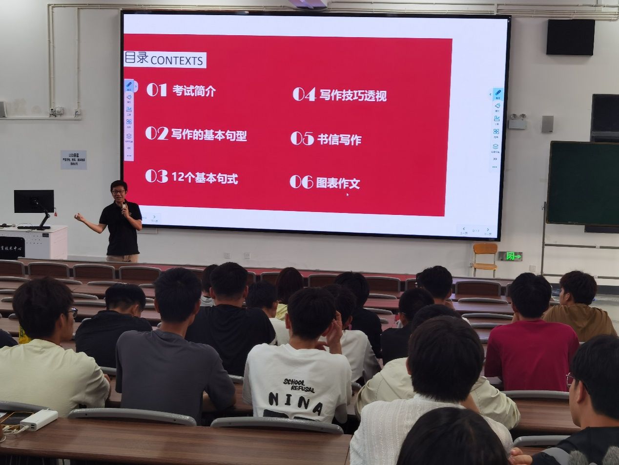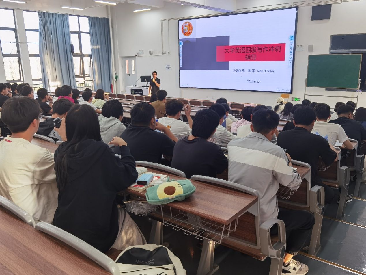 冯老师首先从英语四级考试的重要性、考试题型设置、答题流程、评分标准及考生须知等方面介绍了大学英语四级考试的变化趋势、得分要领、做题思路和答题技巧等。随后,他重点针对四级写作冲刺进行了辅导,从写作的基本句型、12个基本句式、写作技巧、书信写作、图表作文等方面进行了详细讲解。最后,他还从考试时间、考试用品、考前练习、做题顺序、答题规范、心态调整等需要重点注意的事项进行了温馨提示。