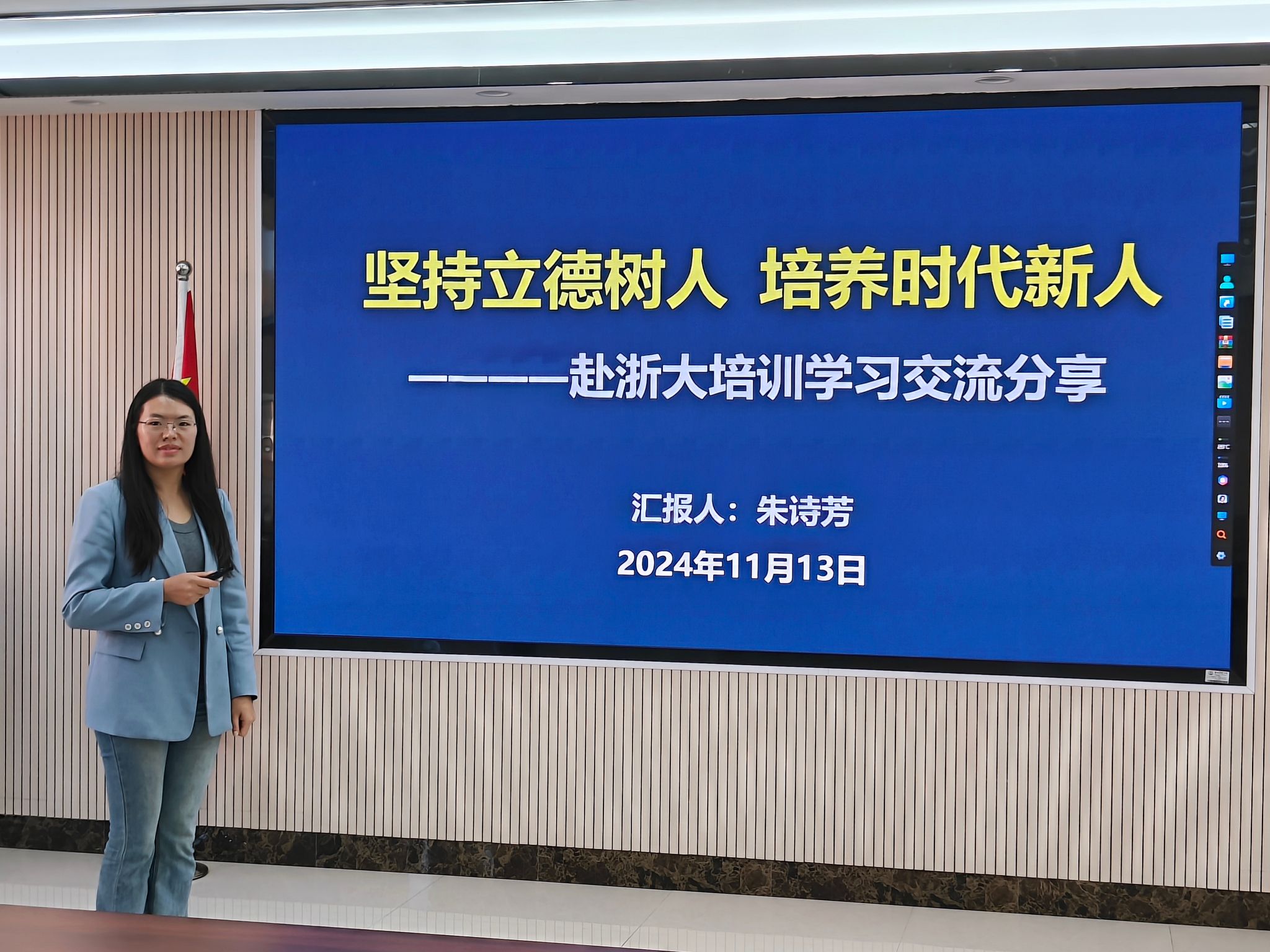 活动伊始,两位赴浙江大学培训学习的辅导员朱诗芳和张玉老师分别就各自的培训经历进行了分享。朱诗芳老师围绕“坚持立德树人,培养时代新人”的主题,详细介绍了本次培训的基本情况、主要课程内容以及个人收获;张玉老师则以“资助育人工作交流分享”为题,结合培训课程《深入学习习近平总书记关于教育的重要论述》及《辅导员如何结合自身专业和学生管理工作开展课题研究》,从资助育人的角度分享了工作经验。两位老师均表示,此次浙大之行收获满满,将努力把所学知识应用到实际工作中,切实履行立德树人的根本任务,培养德智体美劳全面发展的新时代大学生。
