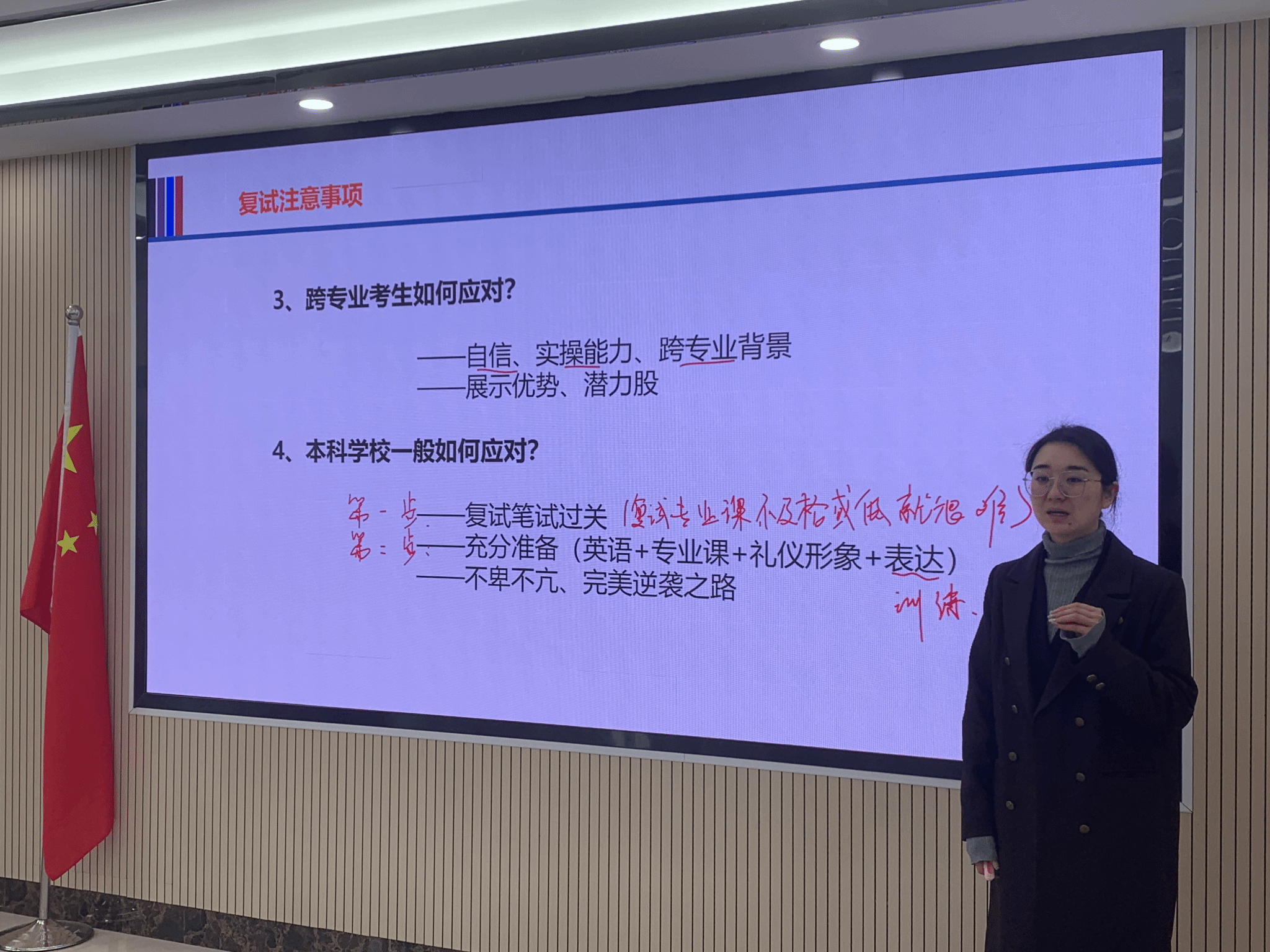 讲座上,虎老师围绕考研复试的时间轴,从前期的复试内容准备和联系导师,到面试过程中的着装、语言动作等细节,都进行了详细的指导,并且对调剂系统的操作,调剂志愿学校的选择以及调剂过程中可能遇见的问题也分别进行了详尽的说明。