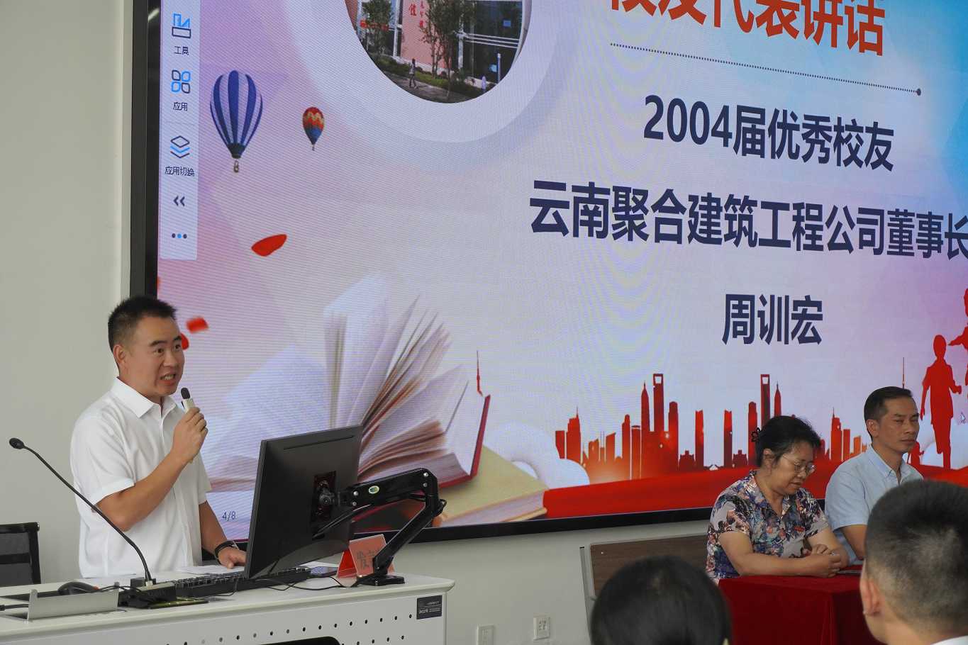 校友代表周训宏分享创业经历与人生感悟,为学弟学妹提供宝贵经验,叮嘱大家珍惜机会,学好专业知识,勇敢面对挑战。