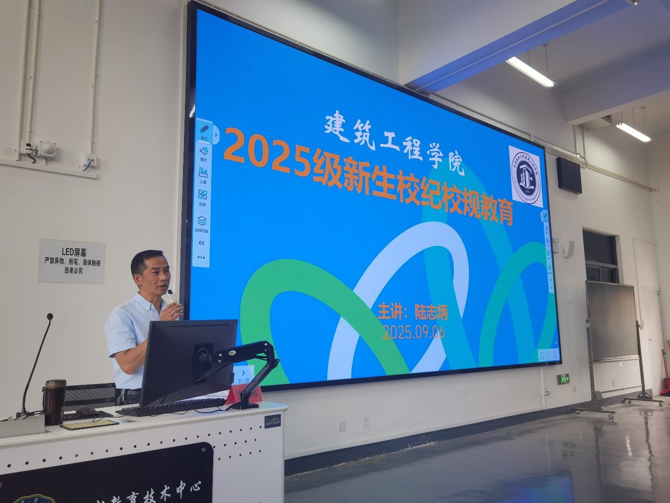 党委副书记陆志炳为新生作了校纪校规专题教育,从规章制度、文明守纪、责任意识等方面引导同学们做遵规守纪的新时代青年。
