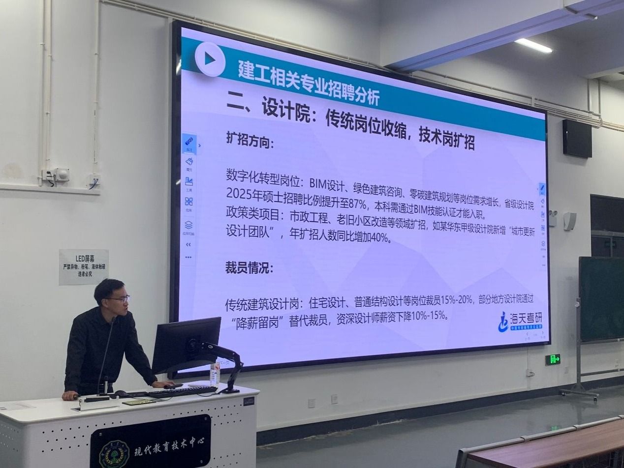 讲座伊始,张智民老师全面剖析大学生毕业后的多元发展方向,聚焦工程建设行业,列举相关代表企业与机构,解读行业特点与发展趋势。他着重指出,近年来工程建设领域就业环境变化显著,竞争加剧、企业人才要求提升,学历在就业中的重要性日益凸显,让同学们深刻认识到考研对于个人未来职业发展的重要意义。