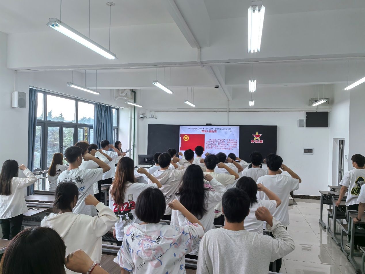 仪式在激昂的国歌声中正式启幕,全体学员肃立,目光坚定,齐唱国歌。随后,大家面向团旗,高举右手,庄严宣誓,重温入团誓词,铿锵有力的誓言在教室中回荡,彰显着学员们对团组织的忠诚与为共产主义事业奋斗的决心。