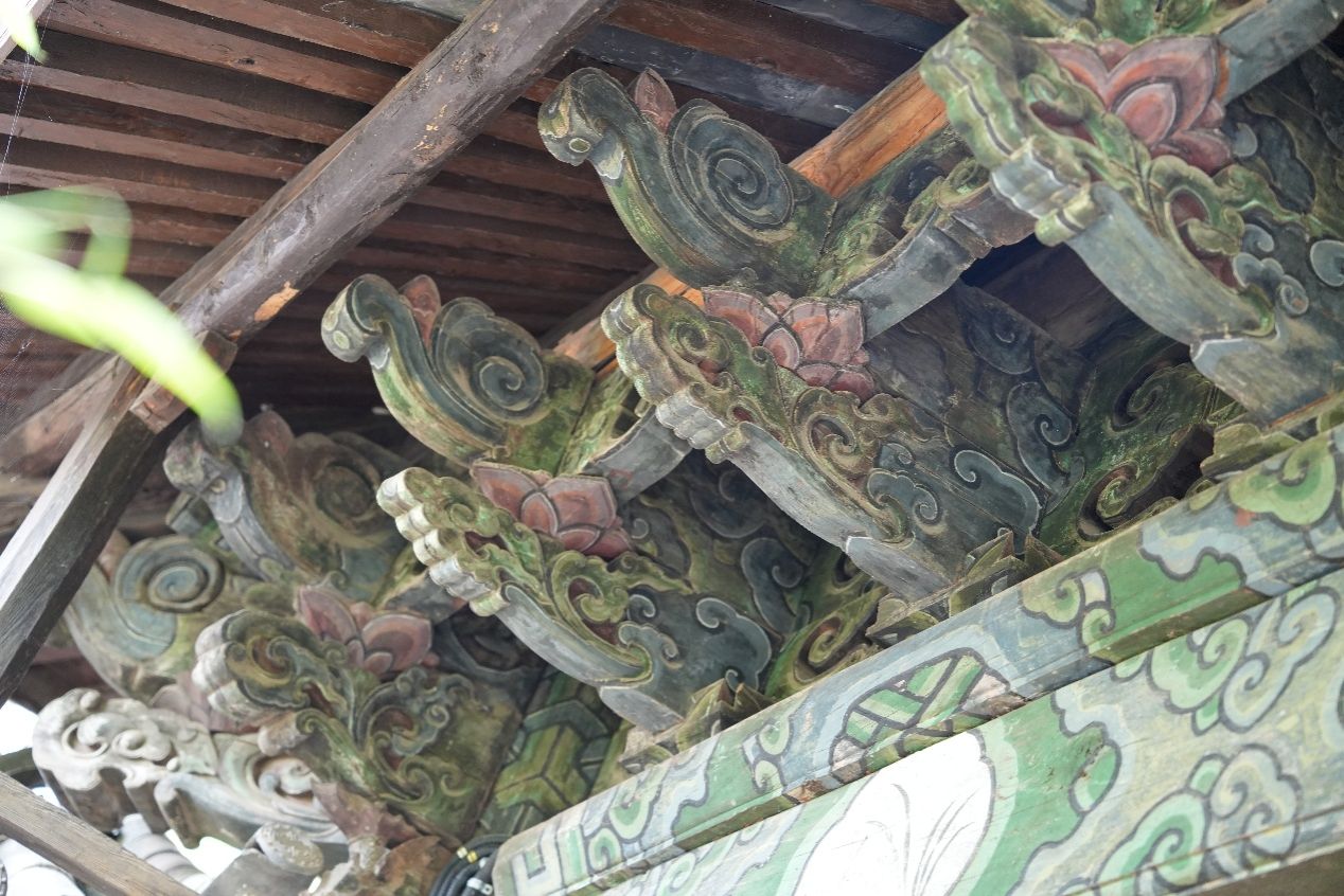 实践团队的首站,是静卧于丽江坝子西陲拉市海畔的指云寺。抬眼望去,指云寺的彩画宛如一幅幅立体的史诗,在梁柱斗拱间徐徐铺陈开来,瞬间吸引了队员们的目光。大家不禁对其彩绘的色彩啧啧称赞,画师们巧妙运用矿物颜料调制的朱砂红、石绿、群青,在木构件上层层晕染,历经百年风雨的洗礼,依然鲜亮如新,仿佛时间在这里放慢了脚步。这些色彩不仅展现了古代画师高超的技艺,更承载着指云寺悠久的历史和深厚的文化底蕴。队员们穿梭于寺庙的殿堂之间,仔细观赏每一处彩画,试图从那细腻的笔触和绚丽的色彩中,探寻到古代佛教文化的奥秘。