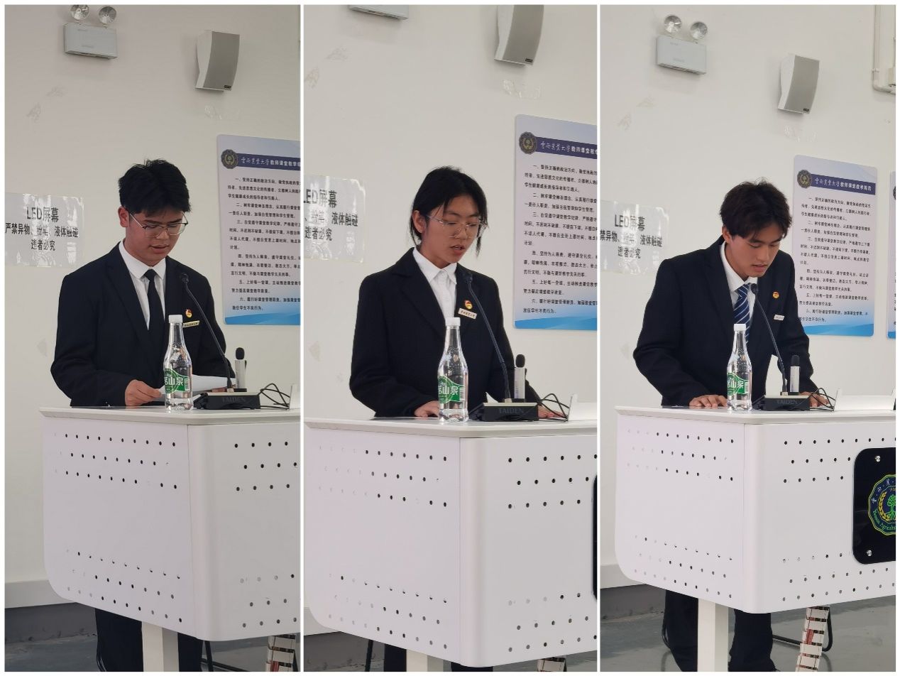 新一届学生会主席团代表毕晓天同学率先发言,他郑重承诺,新一届学生会将继续坚守“全心全意为同学服务”的宗旨,不断加强自身建设,提升服务水平,充分发挥好桥梁和纽带作用。同时,他还提出了新一届学生会的工作目标,将以“土敦木华、正德厚生”的院训为指引,在思想引领、校园文化、权益服务等领域深耕细作,打造“方向正、基础正、结构正”的学生组织,让学生会真正成为同学成长路上的同行者。