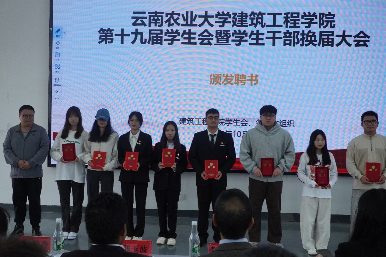 第十九届学生会、第二届院长助理、第二届艺术团、第三届就业与创新创业协会及各运动队的学生干部任职名单。在场领导和老师为新一届学生干部颁发了聘书。一份份聘书,既是荣誉的象征,更是责任的嘱托,在闪光灯的定格中,新老接力的使命感在会场中久久回荡。