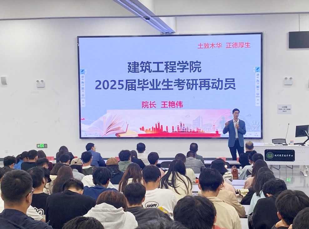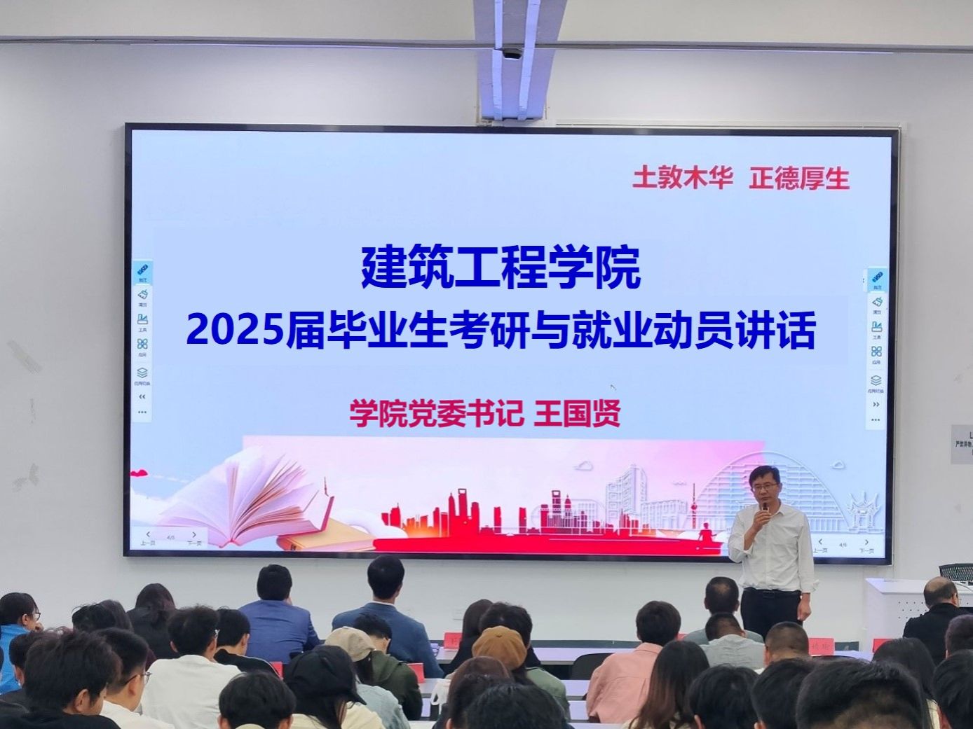 王艳伟院长对2025届毕业生就业和考研进行了再动员,他细致分析了当前工程建设领域的发展状况以及未来趋势,勉励同学们面对严峻就业形势的同时,也要看到机遇和发展方向。他鼓励同学们主动求职,扩宽视野,勇于走出舒适圈,积极走向有岗位需求的省内外地区,充分发挥和实现自身价值。此外,王院长结合未来发展向同学们强调了考研的重要性,希望大家能树立考研目标,坚定意志,扎实备考,不断提升自身学历和能力,增强核心竞争力应对未来的各种机遇和挑战。