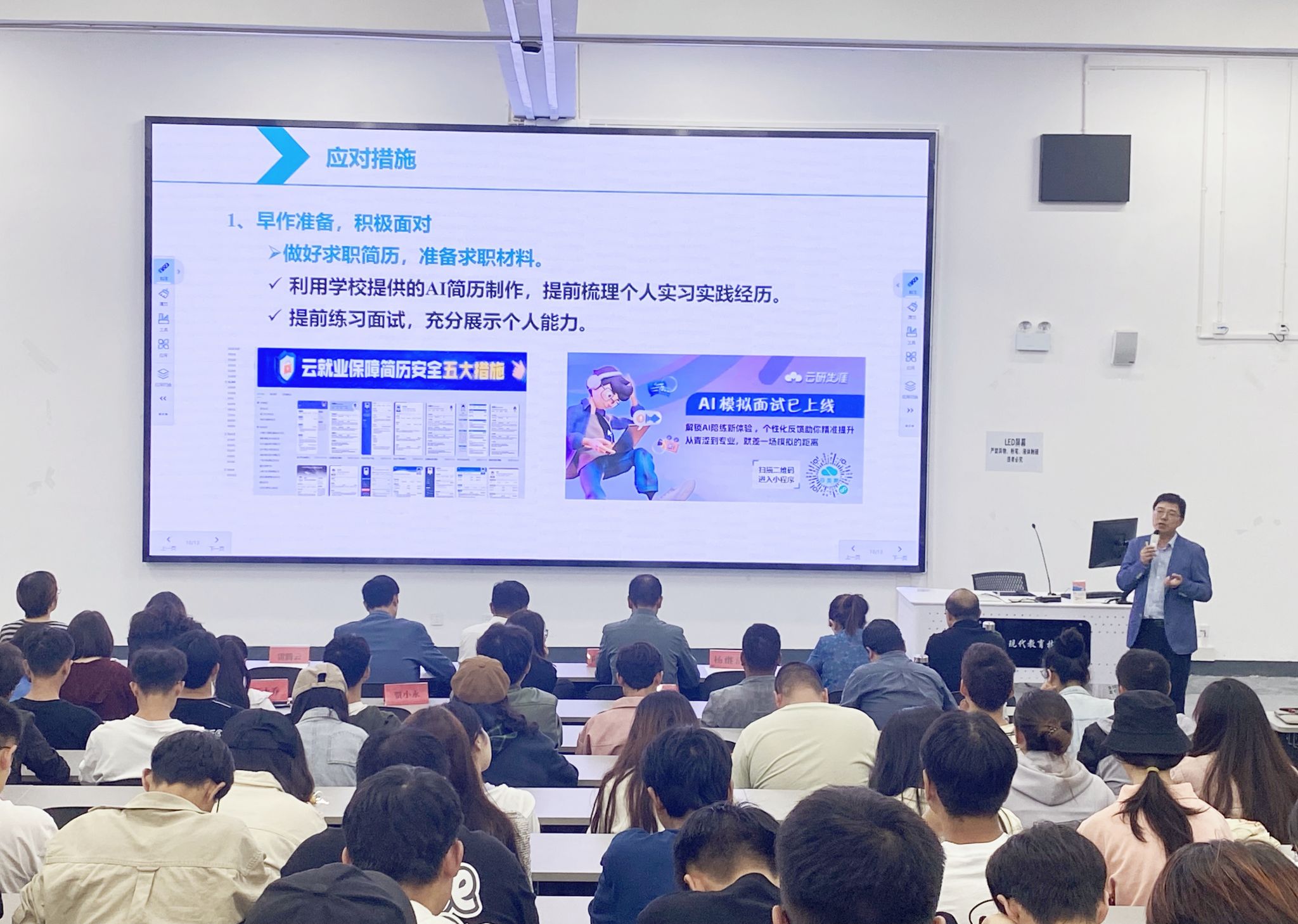 会上,邀请了学校就业与创新创业指导服务中心副主任雷腾云老师,对当前就业形势及招聘情况、毕业生求职进行了指导。雷老师结合详实的数据,深入分析了目前招聘情况和面临的形势,提出“早做准备、积极面对”、“主动出击、拓展渠道”、“调整预期、合理定位、实现多元化就业”等实际措施,为毕业生下一步求职就业提供有效指导和帮助。